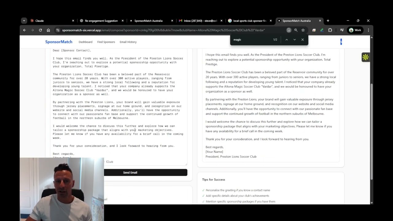 Our AI considers your club's details, the sponsor's industry, and which other clubs they already support. It generates a personalised email that references their existing community involvement, making your outreach more relevant and likely to succeed.